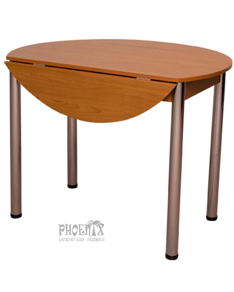 Τραπέζι ροτόντα με ανοικτά τα φύλλα διάμετρο 100cm, με κλειστά 56x100cm, (2x22cm οι δύο προεκτάσεις), καπάκι μελαμίνη και πόδια μεταλλικά χρώμιο ή βαμμένα ασημί.