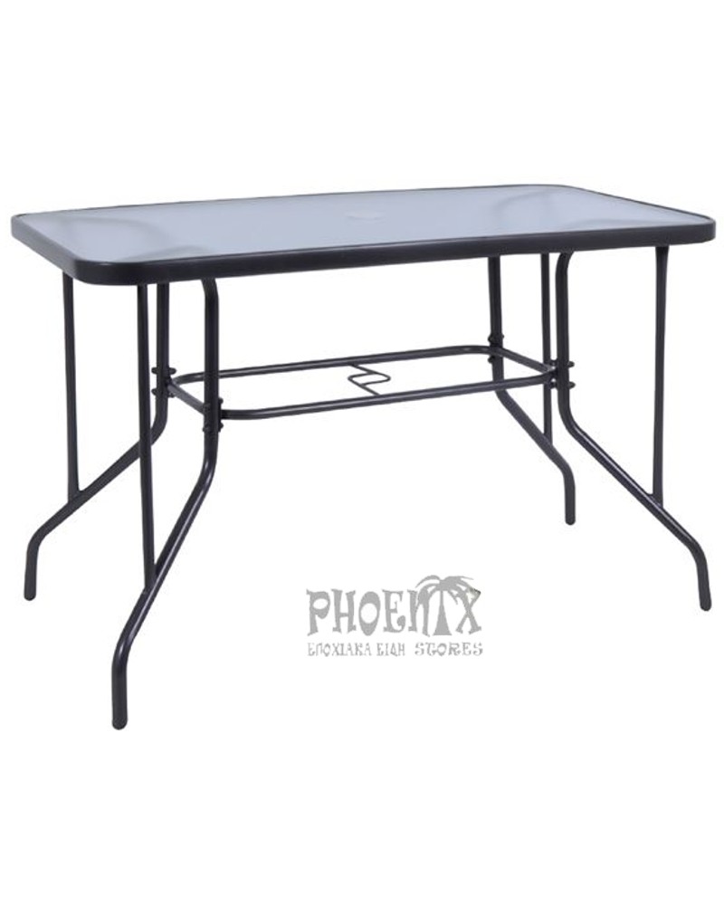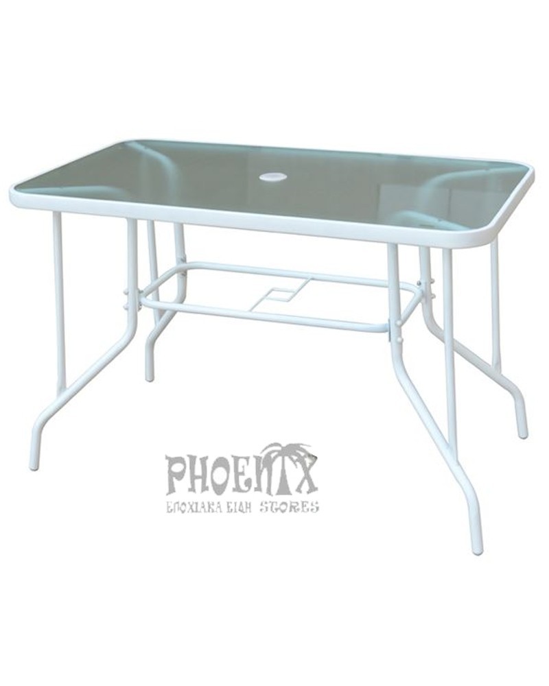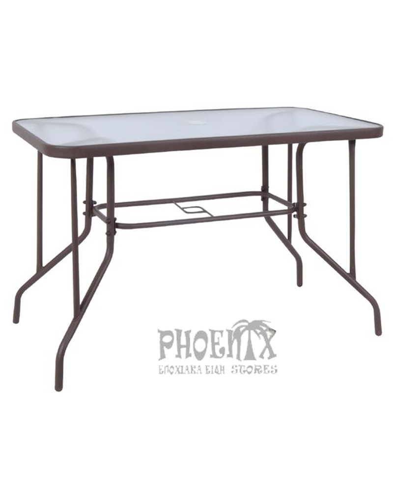 Τραπέζι κήπου/βεράντας παραλληλόγραμμο με γυαλί στην επιφάνεια και μεταλλικό σκελετό σε 3 χρώματα: λευκό, μαύρο, και καφέ.
