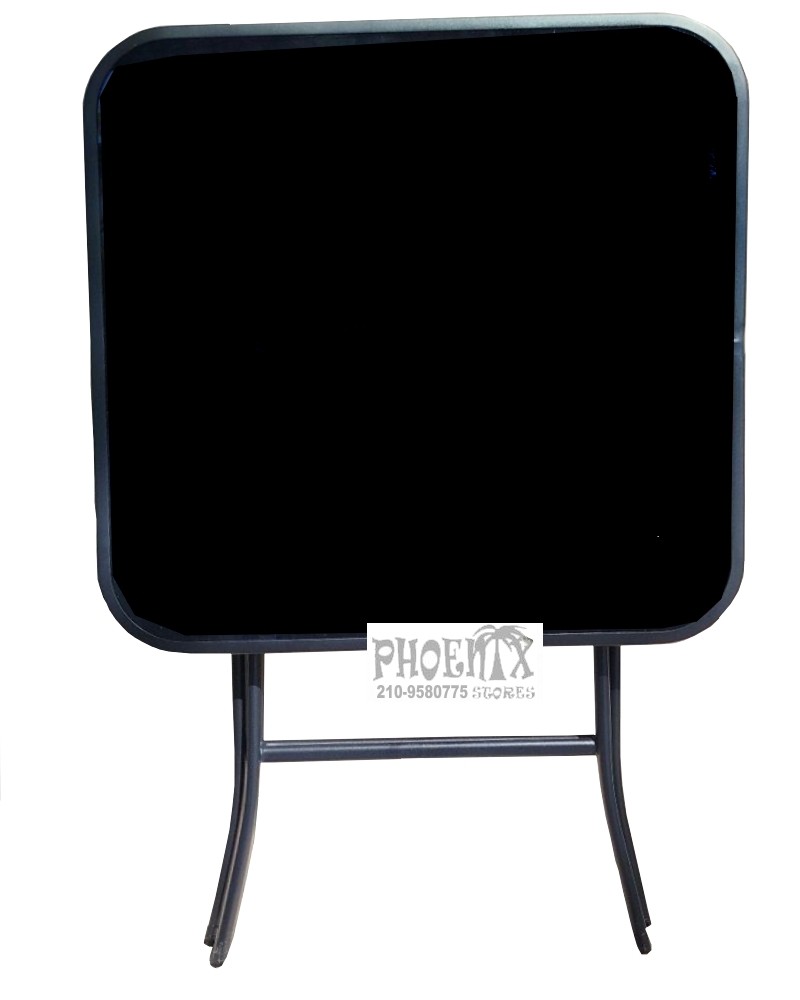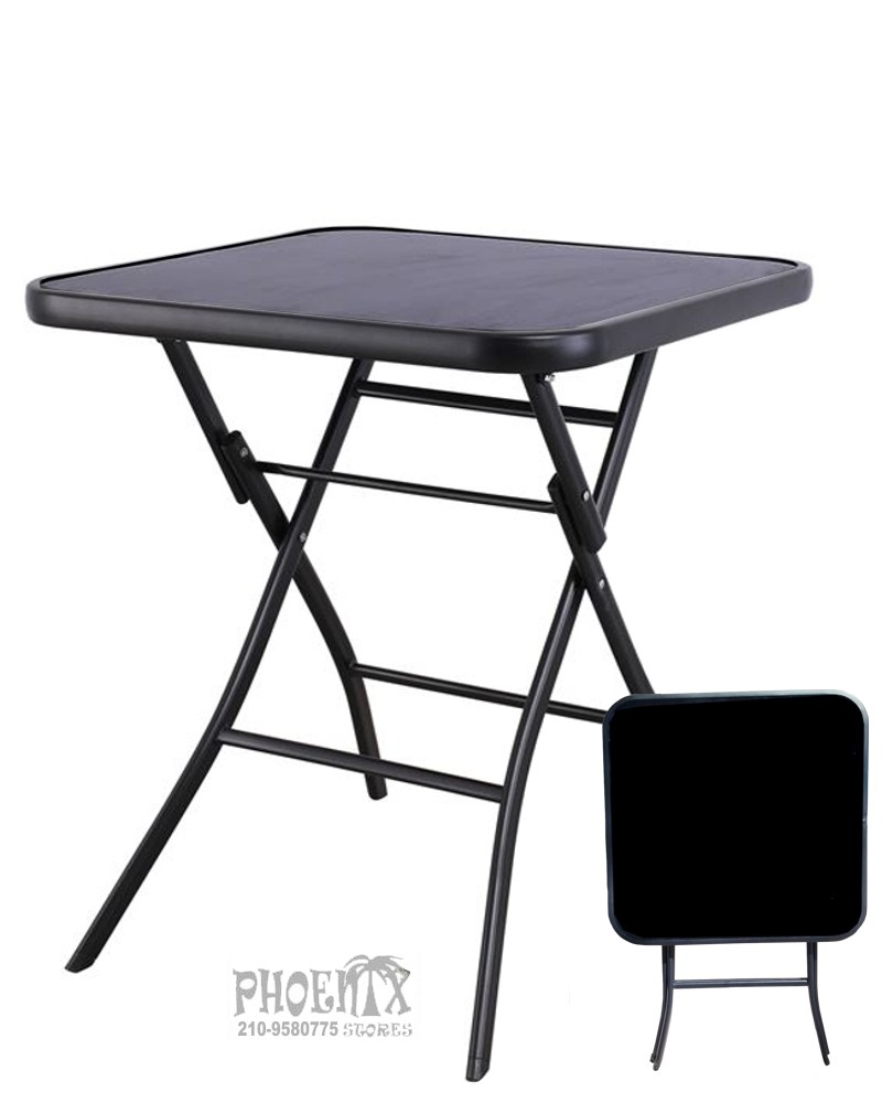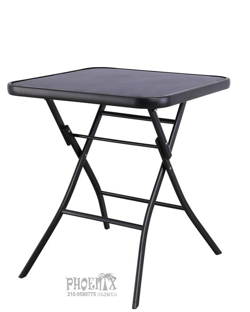 Τραπέζι κήπου τετράγωνο με μαύρο γυαλί [ψημένο] πτυσσόμενο με μαύρο μεταλλικό σκελετό.