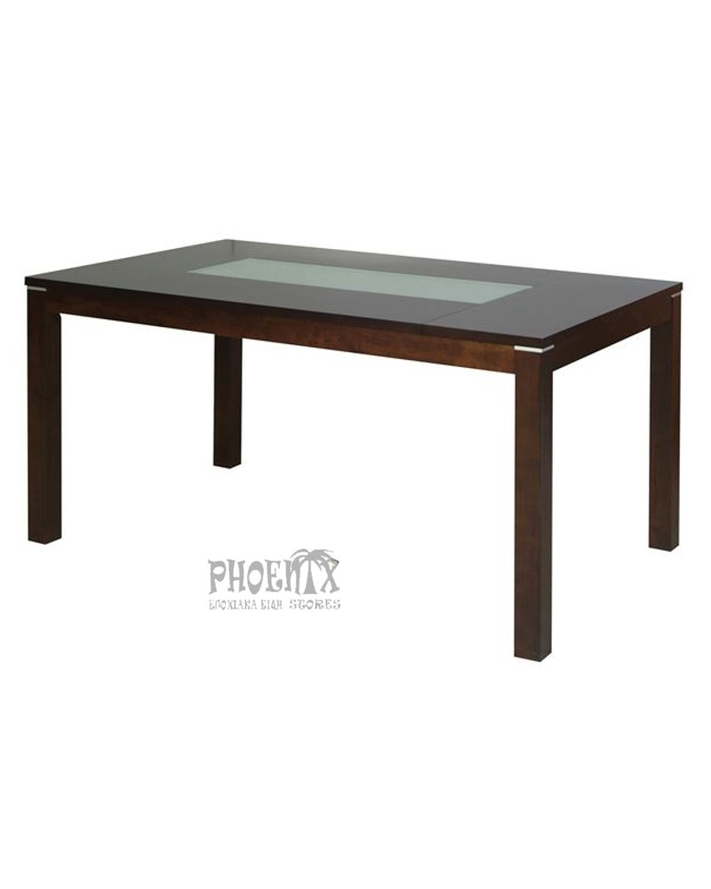 Τραπέζι τραπεζαρίας ή κουζίνας, ξύλινο σε χρώμα καρυδί, παραλληλόγραμμο, με γυάλινη επιφάνεια.