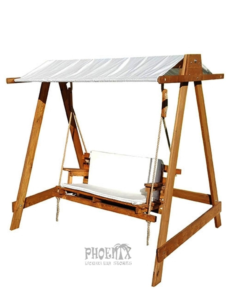 Κούνια ξύλινη με μαξιλάρια και τέντα.