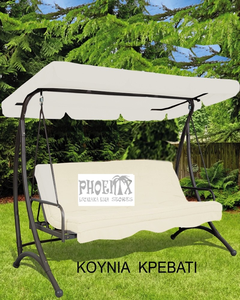 Μεταλλική Κούνια Τριθέσια. Κούνια κρεβάτι με μεταλλικό σκελετό [βαρέους τύπου] με εκρού μαξιλάρια και οροφή. Οι διαστάσεις της είναι 2,20μ Χ 1,05μ και ύψος 1,70μ.