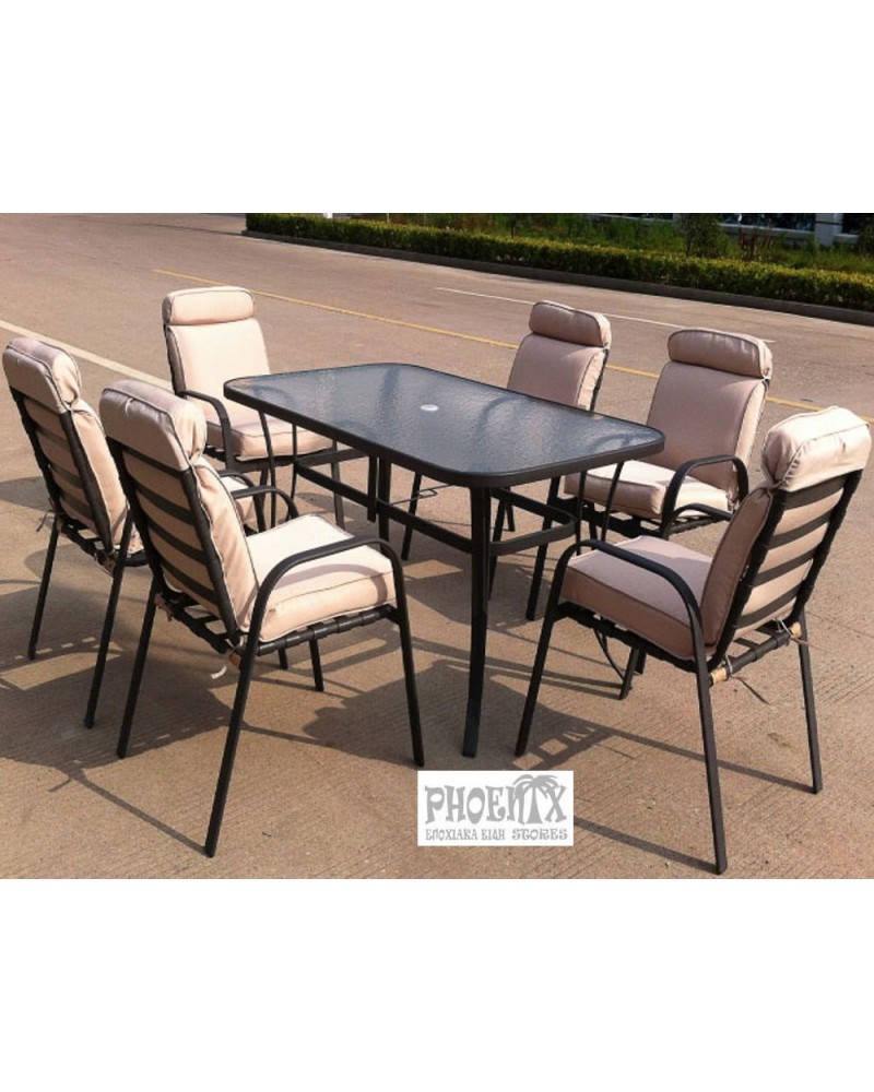 Το σετ συμπεριλαμβάνει 6 πολυθρόνες μαζί με τα μαξιλάρια τους και 1 τραπέζι με γυαλί ασφαλείας.